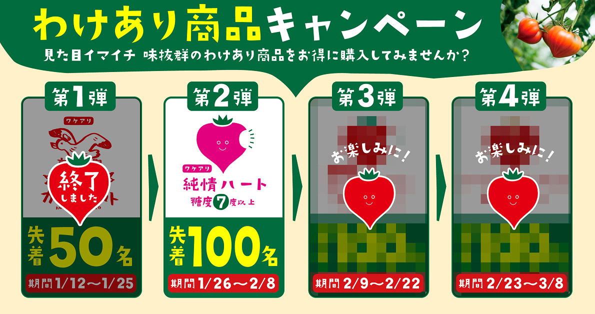 2026年1月24日 本日、わけありキャンペーン第1弾の”わけありかもめのトマト”が定員に達した為、受付を終了いたしました。 沢山のご注文をいただき誠にあり…