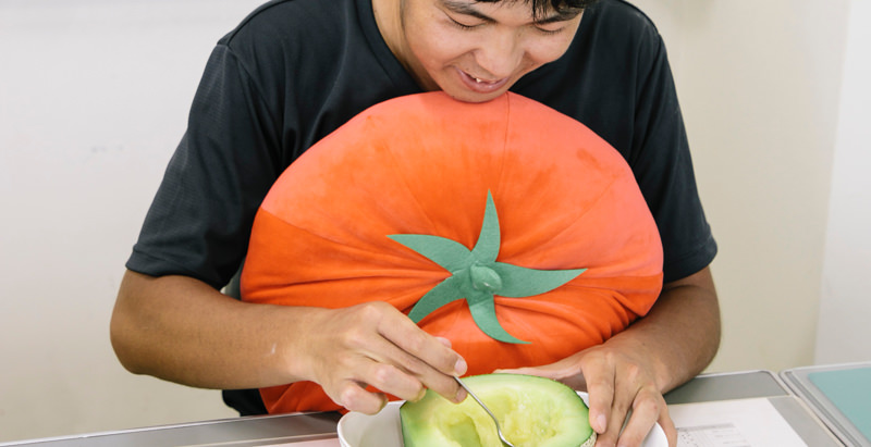 そうだ、メロンばっかり目立つものもトマトに申し訳ないから、このクッション抱えながら食べてみたらどうだろう。